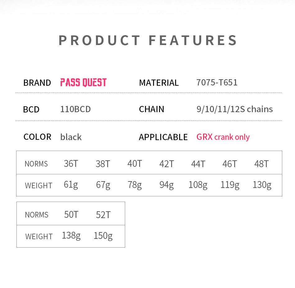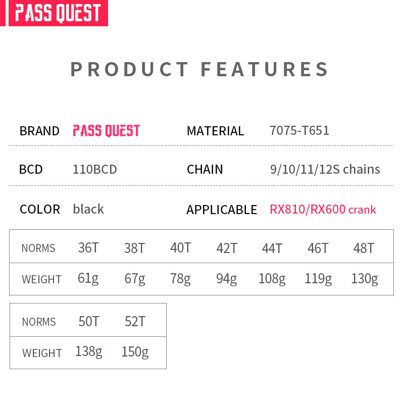 61 (36T), 67 (38T), 78 (40T), 94 (42T), 99 (44T), 108 (46T), 119 (48T), 138 (50T), 150 (52T) |