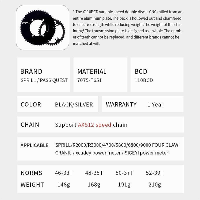 PASS QUEST 2X CHAINRINGThe X110BCD variable speed double disc is CNC milled from the whole aluminum plate, and the back is hollowed out and milled and chamfered to ensure the strength and reduce the weight of the chainring! The speed change disc is designed as a whole, and other gears cannot be replaced, and different brands cannot be matched at will. It takes time to polish the aluminum plate with a thickness of 5mm. The texture and triangular structure ensure the hardness of the chainring while bringing a lighter experience |
